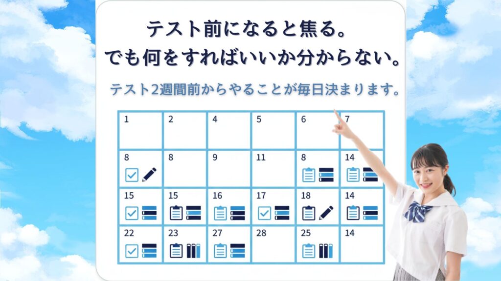 定期テストが近づいてくると、普段の学習プランから少し離れ、徹底した定期テスト対策を行います。